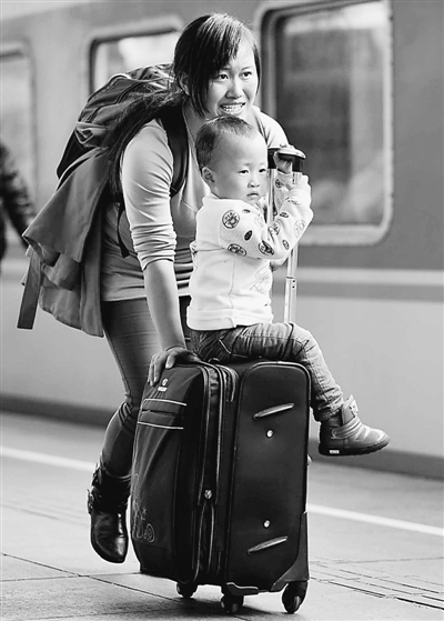 春运期间,广州火车站,母亲带着孩子赶回老家过年。邱伟荣摄(人民视觉)