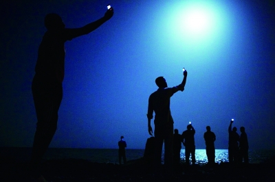 非洲移民夜晚聚集在吉布提海岸,举起手机接收邻国的廉价信号。吉布提是索马里、埃塞俄比亚等国移民至海外的中转站,这些移民将前往欧洲或中东寻求更好的生活。《信号》,2014年荷赛年度图片奖,约翰·斯坦梅耶摄