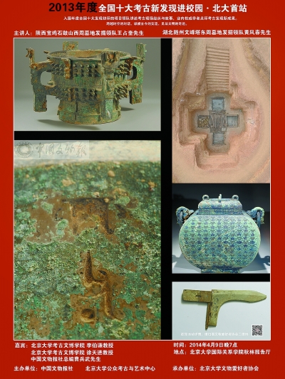 四月的燕园,已是百花齐放,春意盎然,一派生机勃发的景象。4月9日傍晚,“十大考古新发现进校园·北大首站”活动为活跃的校园气氛再次加温。陕西宝鸡石鼓山西周墓地和湖北随州文峰塔东周墓地的考古领队来到这里,与考古爱好者们分享自己的发现与心得。而就在两个多小时前,这两个项目刚刚入选“2013年十大考古新发现”。
