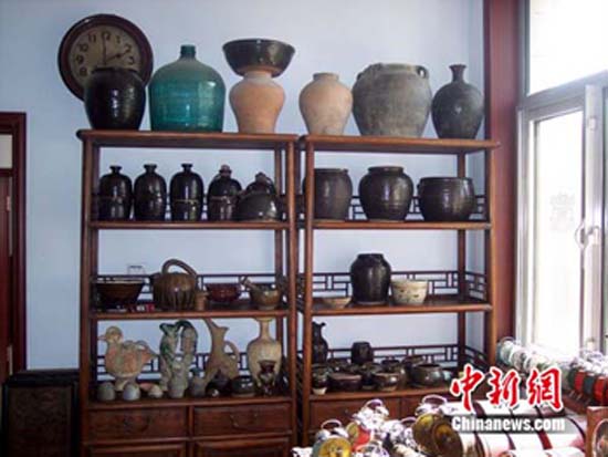 在“民俗大院”,孙玉贵将收集来的陶陶罐罐码放的整整齐齐,真像一个博物馆。谭地摄
