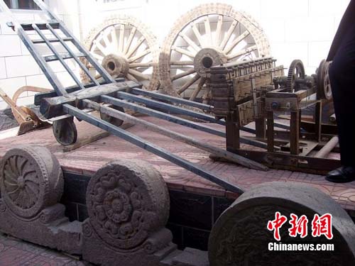 石雕碾盘,花轱辘牛车饼,耙地用的农具堆满了孙玉贵的“民俗大院”。谭地摄