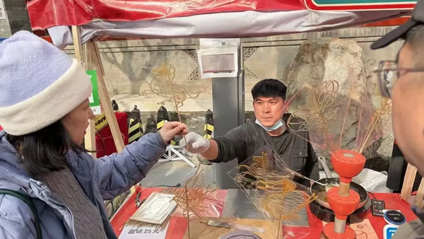 看着看着,表妹突然说起在成都逛庙会的场景。四川的糖画以成都一带最有代表性,成都糖画还被列入国家级非物质文化遗产代表性项目名录。小时候过年,她也是这样围在糖画摊前,拨动转盘,看师傅画脸谱、画花鸟鱼虫。糖浆在案板上流动,空气里满是甜味,那是她熟悉的年味。