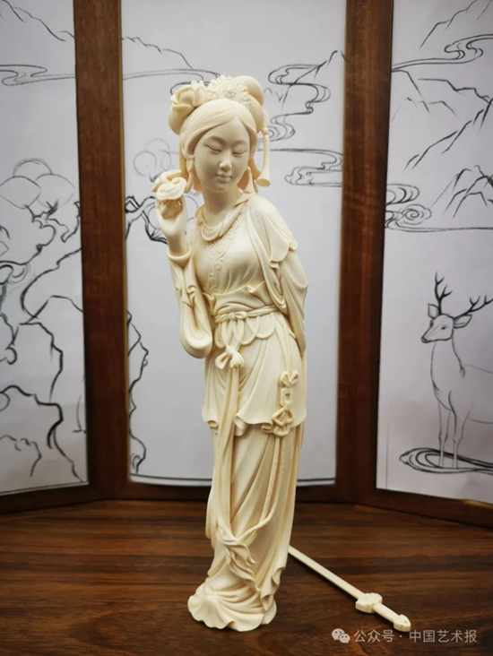 【作品介绍】《盗仙草》取材自戏曲《白蛇传》中的经典情节,讲述了白素贞为救被惊吓而死的丈夫许仙,冒险前往昆仑山盗取灵芝仙草的故事,这件猛犸牙雕作品呈现了获得仙草后的白素贞手持仙草、内心满是激动与期盼的生动姿态。作品通过传统的雕刻工艺与现代设计理念的融合,既展现出人物优美的姿态,又充分体现出猛犸象牙材质本身的温润美感。