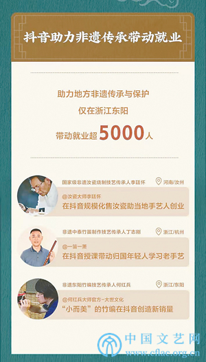 像这样一直默默坚守、身体力行去传承非遗文化的大师,在抖音上还有很多,如汝瓷烧制技艺传承人李廷怀、口技项目传承人方浩然、中国盘纸传承人严美娟、铜雕技艺传承人朱炳仁、南京云锦木机妆花手工织造技艺传承人周双喜、扇技艺(王星记扇)传承人孙亚青、景泰蓝制作技艺传承人钟连盛,以及年轻一代传承人,如表演非遗独竹漂的95后贵州女孩杨柳、19岁从流水线工厂出走返乡后成为90后剪纸艺术家的畅杨杨、用手势舞传播国学的杭州80后公务员宝妈秦一……