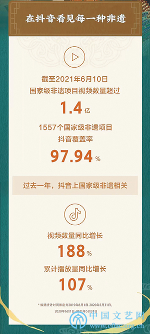 6月11日,抖音发布了《抖音非遗数据报告》,数据显示截至今年5月,抖音上国家级非遗项目相关视频数量超过1.4亿。在目前国务院公布的1557个国家级非遗项目中,抖音平台上的相关视频涵盖率达97.94%,抖音已成为最大的非遗展示、传播平台,“视频版非遗百科全书”。