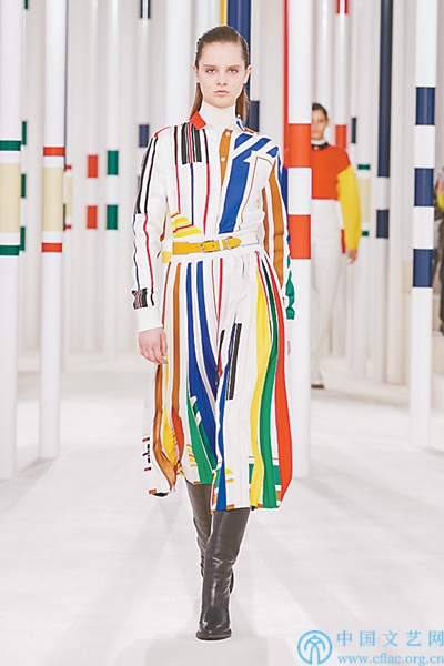 到了2020年,爱马仕的秋冬秀场再一次把蒙德里安的“极致原色”带回公众视野。设计师范内·齐布尔斯基用经典三原色的设计,再次诠释蒙德里安绘画中的“红黄蓝”。在这一系列中,真丝半身裙和连衣裙的裙褶中饰有线性图案,长条形的色彩以不同比例进行搭配组合,活跃且跳动,像钢琴的琴键,也像蒙德里安在《百老汇爵士乐》中描绘的一样,富有韵律的欢快。另一件落肩针织衫以红色做大身,两袖和领口分别为黄色、蓝色和黑色,高度还原蒙德里安的精神。此外,爱马仕在白色的秀场里放有许多色块相间的圆柱,似马术障碍赛的横杆,模特们从中穿行而过,如同穿梭在蒙德里安的绘画世界,形成迷幻又前卫的未来主义风格。