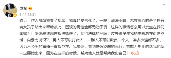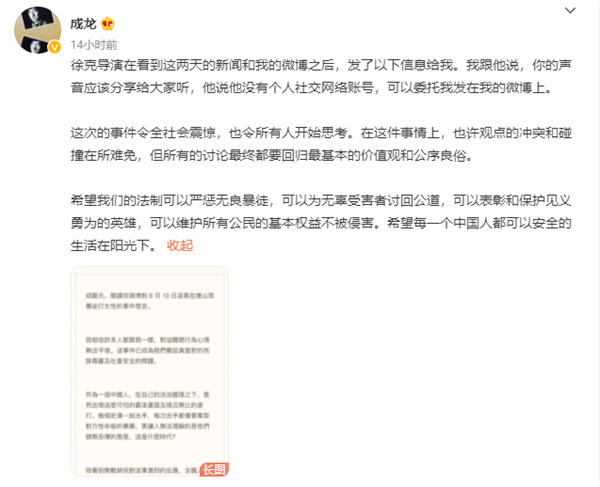 导演徐克委托成龙为唐山打人事件发声:“我一再思考,我们目睹的事件,并不是旁人难以厘清的复杂情况下的混乱打斗。而是几个人对其他人类毫无尊重,对法律毫无畏惧,出手毫无理由的暴力侵犯……我希望这恐惧及不安,不能平复的情绪,能有应当的权威来证明,我们作为现在的中国人,是不用担心的,也是不应该担心的。”