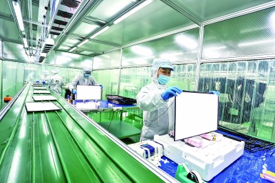 江西瑞昌经济开发区智造小镇,工人在生产线上生产电视机显示屏。魏东升摄/光明图片