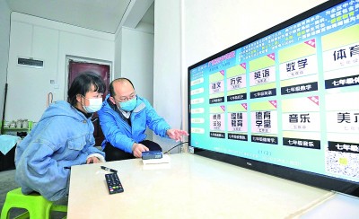 广西融安县老乡家园融城易地搬迁小区,中国移动融安县分公司工作人员(右)为七年级学生讲解如何用电视学习网络课程。谭凯兴摄/光明图片