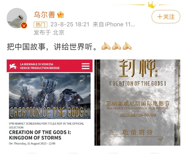 《封神第一部》“扬帆出海”,在第80届威尼斯国际电影节的电影市场进行特别放映。导演乌尔善为此发文,“把中国故事,讲给世界听”,向世界传播中国神话故事的独特魅力。