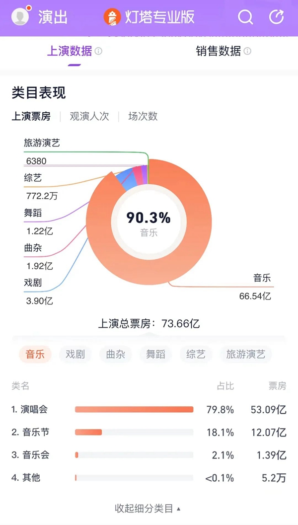 灯塔专业版数据显示,截至9月18日,年度内累计产出的线下演出收入中,音乐类演出销售贡献在90%以上;其中,演唱会的票房收入占比超79.8%。