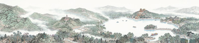 自古以来,中国绘画便有运用山水长卷咏颂江山社稷的传统。当代3幅长卷《中国大运河史诗图卷》《北京大运河揽胜图卷》《京杭大运河揽胜图》,堪称接续这一传统的代表作。2021年4月,总长135米、高3米的《中国大运河史诗图卷》亮相中国国家博物馆。由江苏省文化和旅游厅组织创作的这幅长卷,聚8省市15名书画家之力,在对大运河沿线风貌深入考察基础上,历时一年创作完成。43米长的上卷人物篇,通过春秋争霸、雄才大略、汴河畅通、一统天下4个历史画面,讲述了大运河开凿、发展、西进、通航等历史进程。64米长的下卷山水篇,分北国瑞雪、冀鲁高秋、江淮绿野、吴越花雨4个章节,表现了大运河沿线四季景色和改革开放以来的新景观。28米长的书法题跋,则涵盖各篇章文字介绍和题记。长卷徐徐展开,画面内的空间与时间随视线流动,勾皴点染下的笔墨山河,连带附着其上的人文故事,尽显自然与历史交织的万千气象。