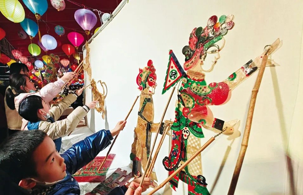 2023年2月6日晚,湖北武汉,市民参加“夜游湖北省博物馆”活动。图为江汉平原皮影戏。