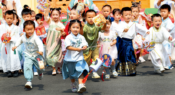 2023年9月28日,江西省德兴市城南幼儿园一群身穿汉服的小朋友手提中秋花灯,开心向前奔跑。