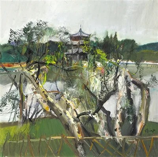油画《临海东湖》,作者杨参军。