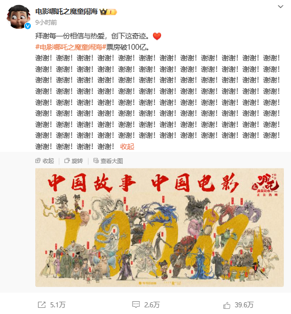 “吒儿,三岁‘百亿男主角’横空出世。从‘我命由我不由天’到‘我想试试’,你用少年的倔强扛起了国漫的里程碑,也让我们看到中国电影的无限可能——票房破百亿不是终点,是向世界喊话的新起点!小哪吒 冲冲冲”