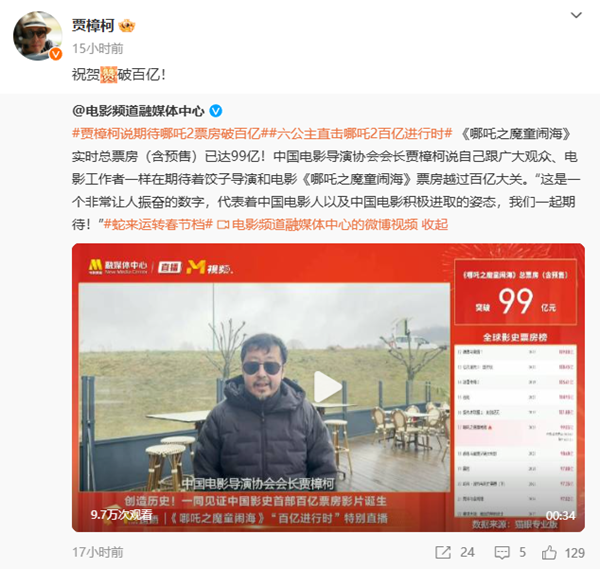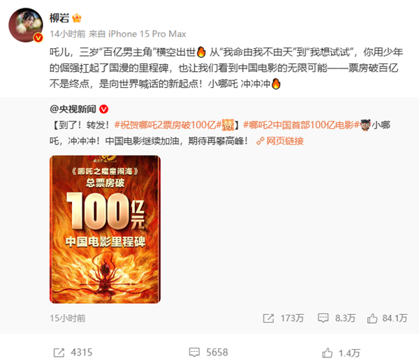“恭喜我们的百亿影帝小哪吒!祝愿中国电影越来越好!”