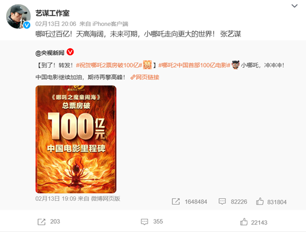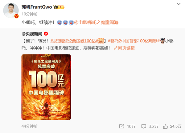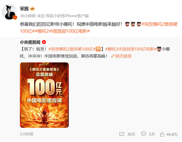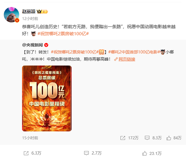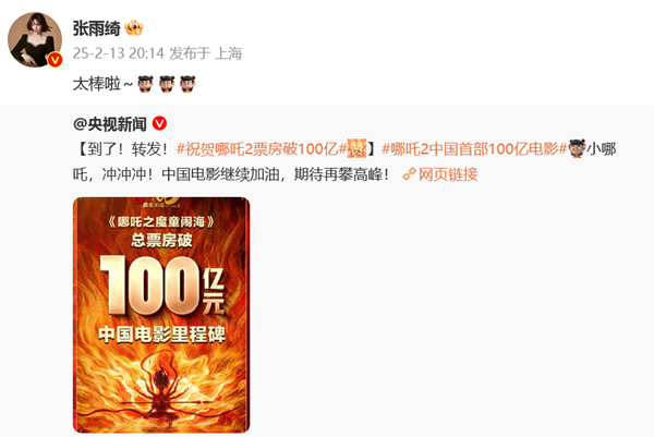“这是一个非常让人振奋的数字,代表着中国电影人以及中国电影积极进取的姿态,我们一起期待!”后转发表示:“祝贺,破百亿!”