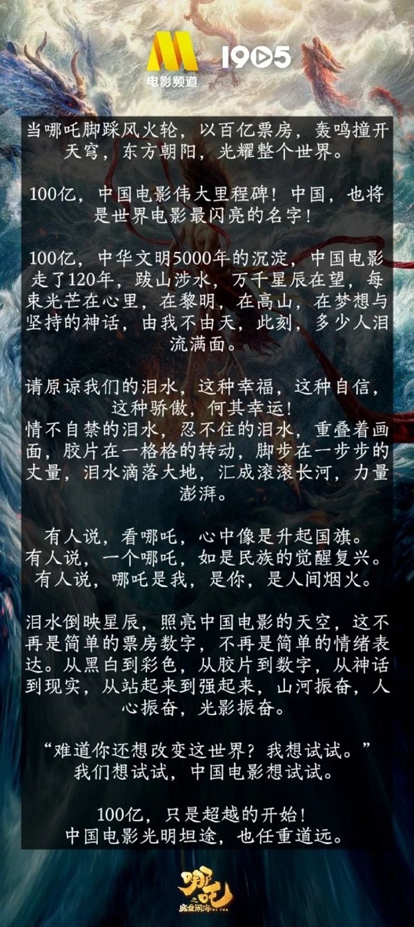 这部作品创造了票房奇迹,弘扬了中华优秀传统文化和时代精神,创新了当代中国电影形态,彰显了中国电影人不懈努力的艺术追求,极大提振了电影界信心。《哪吒》的荣耀,是中国电影的高光时刻,更是中国电影从高原迈向高峰的重要时刻。我们坚信,在电影人与观众的双向奔赴中,中国电影必将以更蓬勃的创造力、更开放包容的姿态,开创更加美好的未来。