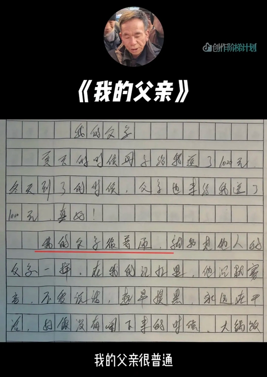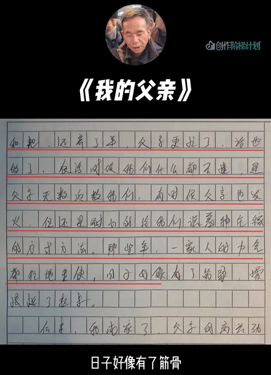 时隔半年,因写高考作文《我的母亲》走红的农民工安三山(安大叔)再写作文《我的父亲》,文字质朴,感情真挚,触动无数网友。这一次,他依旧和抖音创作者@慕七七 合作,完成了撰写一篇高考作文即得1000元稿酬的街头挑战——