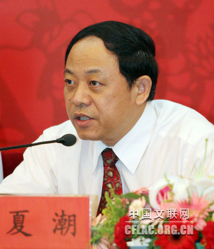 6月29日,首届中国剪纸艺术节暨第十届山花奖·民间工艺美术奖(剪纸类)评奖活动新闻发布会在北京人民大会堂举行。图为中国文联党组成员、书记处书记夏潮在发布会上讲话。中国文联网 余宁 摄