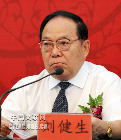 6月29日,首届中国剪纸艺术节暨第十届山花奖·民间工艺美术奖(剪纸类)评奖活动新闻发布会在北京人民大会堂举行。图为原河北省副省长、省政协副主席刘健生在发布会上讲话。中国文联网 余宁 摄