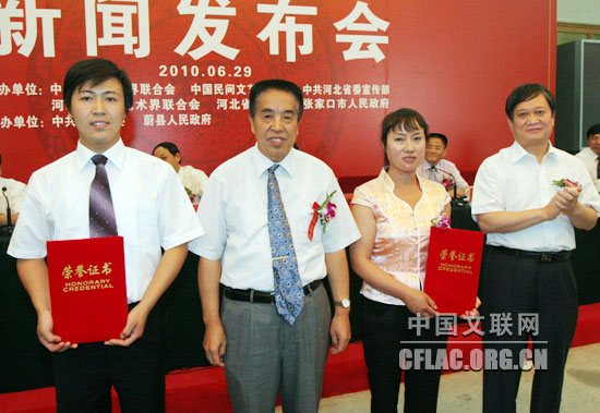 6月29日,首届中国剪纸艺术节暨第十届山花奖·民间工艺美术奖(剪纸类)评奖活动新闻发布会在北京人民大会堂举行。图为中国民协副秘书长赵铁信、河北省文化厅副厅长彭卫国向“窗花姑娘”和“巧手汉子”荣誉称号获得者颁发证书。中国文联网 余宁 摄