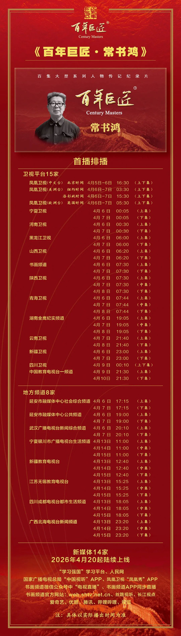4月4日,“致敬巨匠 传承文脉——《百年巨匠》百人播出纪念会暨《百年巨匠-常书鸿》首播仪式”在北京百年巨匠美术馆举行。今年4月6日是常书鸿先生诞辰122周年纪念日,以影像致敬巨匠、以首播缅怀先贤,既是对常书鸿毕生守护敦煌文明的最高礼赞,也是对其精神遗产的传承与延续,让观众在纪念先生的特殊时刻,读懂他“以毕生赴使命”的坚守与担当,让“敦煌守护神”的精神在新时代焕发新的光芒。
