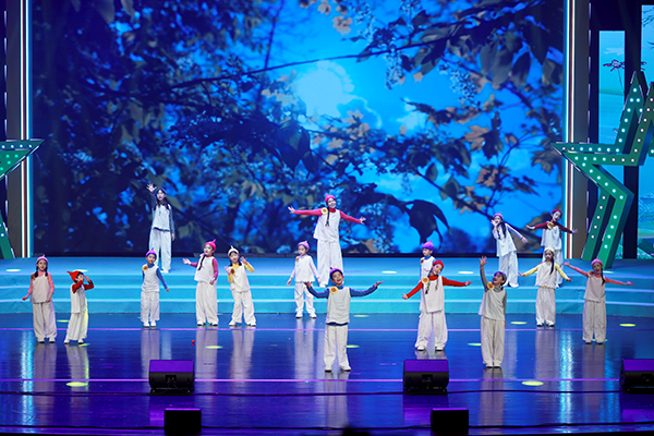 舞台上,小兄妹主持人串联起整场演出。哥哥像一位小导游,妹妹活泼地不停问着“为什么”。两人就像进行一场春日游学,带着观众进行一场边走边唱的旅行。从江南水乡的《好时光》到西湖边的《饮湖上初晴后雨》,从老北京的《春风跑过古城门》到歌唱56个民族的《星星连心一家亲》,小演员们用歌声表达对祖国大好河山的热爱。