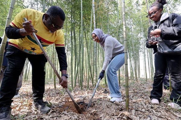Foreigners dig up bamboo shoots in an agricultural park in Huzhou, east China's Zhejiang province. (Photo/Xie Shangguo)