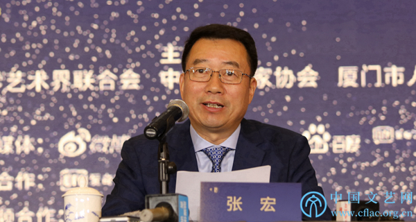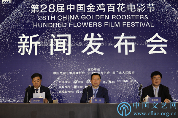 11月19日,第28届中国金鸡百花电影节新闻发布会在厦门举行。图为中国电影家协会分党组书记、驻会副主席张宏介绍第32届中国电影金鸡奖评奖情况和第28届中国金鸡百花电影节主体活动情况。