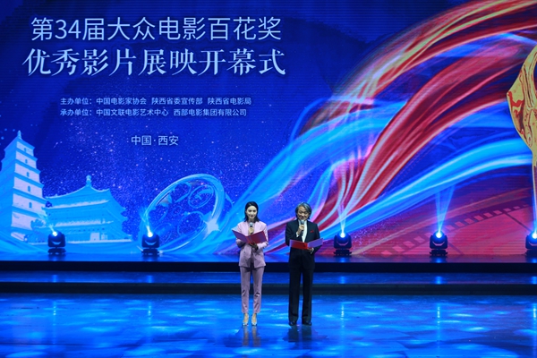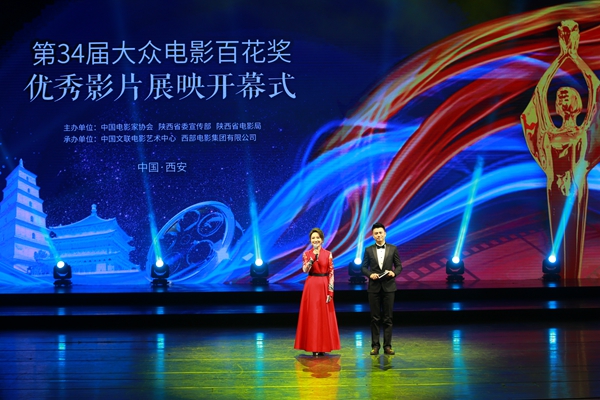 1月13日,“第34届大众电影百花奖优秀影片展映”在陕西大剧院开幕。图为主持人冀星、张岩。