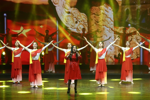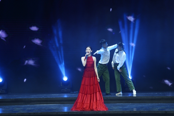 1月13日,“第34届大众电影百花奖优秀影片展映”在陕西大剧院开幕。图为郭蓉演唱歌曲《红旗飘飘》、《歌唱祖国》。