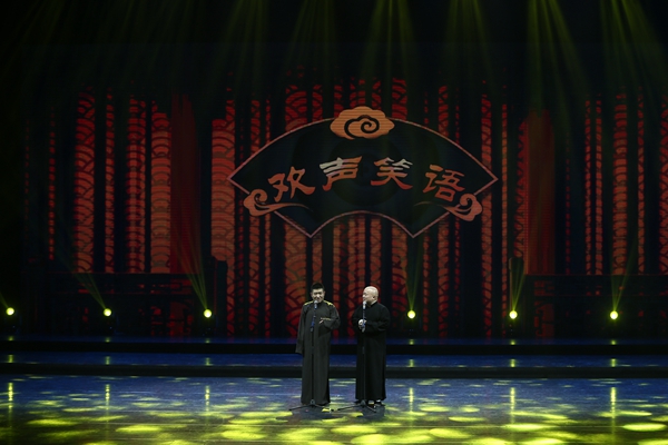 1月13日,“第34届大众电影百花奖优秀影片展映”在陕西大剧院开幕。图为苗阜、马凯强表演相声《欢声笑语》。