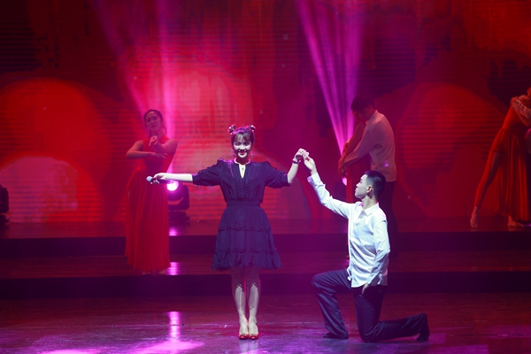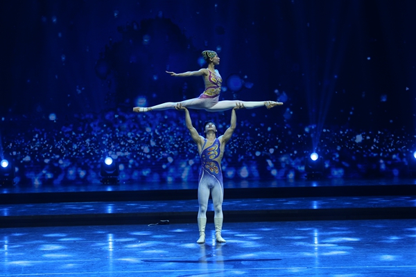 1月13日,“第34届大众电影百花奖优秀影片展映”在陕西大剧院开幕。图为孙艺娜、周杰表演杂技《肩上芭蕾》。