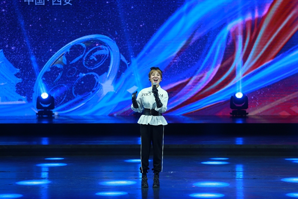 1月13日,“第34届大众电影百花奖优秀影片展映”在陕西大剧院开幕。图为贝贝演唱歌曲《蓝莲花》。