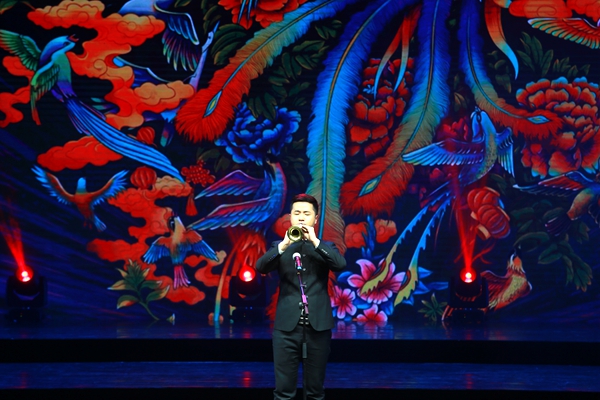 1月13日,“第34届大众电影百花奖优秀影片展映”在陕西大剧院开幕。图为吕海东表演唢呐独奏《百鸟朝凤》。