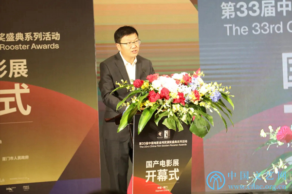 11月25日,第33届中国电影金鸡奖颁奖盛典系列活动国产电影展开幕式在福建厦门举行。图为厦门市委常委朱子君在开幕式上致辞。