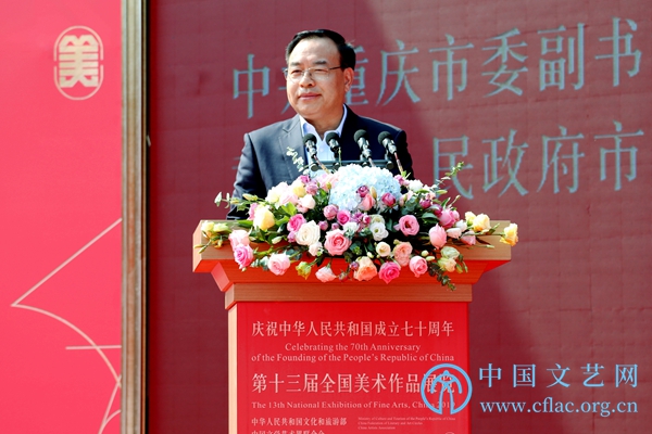 9月22日,“第十三届全国美术作品展览油画作品展”在重庆开幕。图为中共重庆市委副书记、重庆市人民政府市长唐良智在开幕式上致辞。中国文艺网 韩雪竹摄