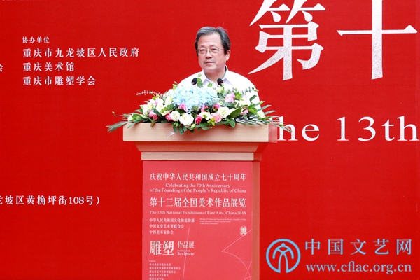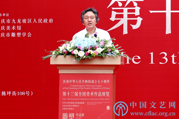 9月25日,“第十三届全国美术作品展览雕塑作品展”在重庆开幕。图为中共重庆市委宣传部副部长张洪斌致辞。中国文艺网 韩雪竹摄