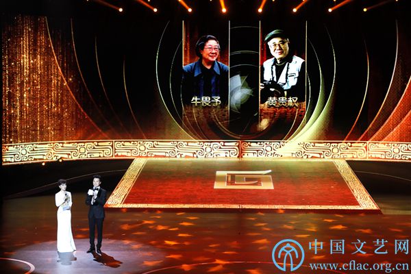 11月18日,第十二届中国摄影金像奖颁奖典礼在三门峡举办。图为颁奖典礼现场表彰获得“中国文联终身成就摄影家”荣誉称号的牛畏予、黄贵权两位摄影界元老。陈黎明 摄