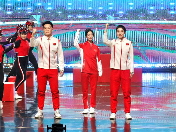 11月4日,第14届中国金鹰电视艺术节开幕式暨文艺晚会在湖南省长沙市举行。图为任子威、曲春雨、李庚希表演情景音乐秀《闪亮的我们》。