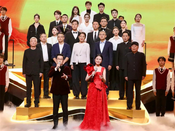 11月4日,第14届中国金鹰电视艺术节开幕式暨文艺晚会在湖南省长沙市举行。图为石倚洁、龚爽领唱《领航》。