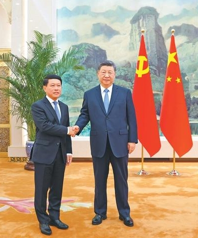 4月21日下午,中共中央总书记、国家主席习近平在北京人民大会堂会见作为老挝人民革命党中央总书记、国家主席通伦特使专程来访的老挝人革党中央政治局委员、常务副总理沙伦赛。新华社记者 黄敬文摄