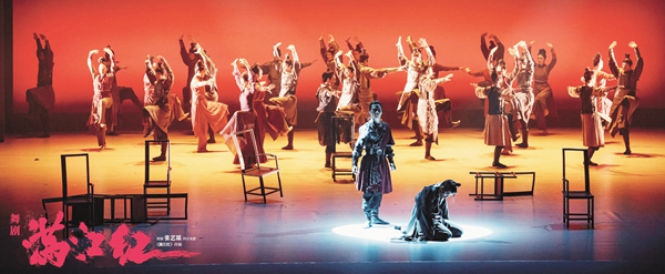 大幕开启,舞台暗黑,急促密集的锣鼓点骤然响起,让熟悉电影《满江红》的观众在似彼非彼的音乐中,瞬间脑补影片开头五进院逼仄狭长甬道上的一通“暴走”;此时,一只庞大的黑鸟扑闪着近乎笼罩世界的巨大翅膀,压抑着所有人的内心;音乐骤停,黑鸟被射杀于地;切光后,幽鸣萧瑟的旋律中,以舞台中央一把太师椅为核心,一只拟人化的黑鸟、一顶硕大的官帽和一袭黑袍的秦桧,构织出一场张扬着无限权力欲望的舞蹈书写……