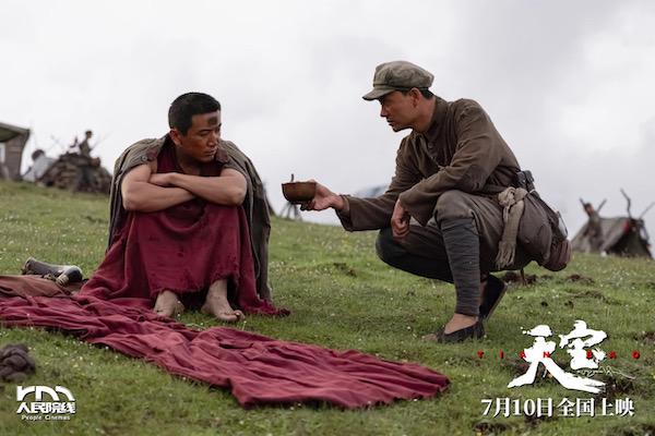 电影《天宝》在叙事方式上进行了多维度的探索与突破,既打破部分人物传记“流水账”式的线性结构,又构建出丰富而立体的叙事空间。影片采用非线性叙事手法,从人物的感受和记忆出发,有意识地打乱时空顺序,使观众能更深入地理解天宝内心信仰的变化与精神成长。例如片头在错位时空下出现的吉普车的画面,就已暗示其叙事结构的自由与多重层次。与此同时,影片巧妙融合红色叙事、民族叙事、解放叙事与传奇叙事,在天宝从一个“小扎巴”成长为我党高级干部的过程,不仅体现了他个人的觉醒与成长,更象征着中华民族在革命的锤炼中逐步觉醒,并在各民族携手并进的发展进程中不断前行。