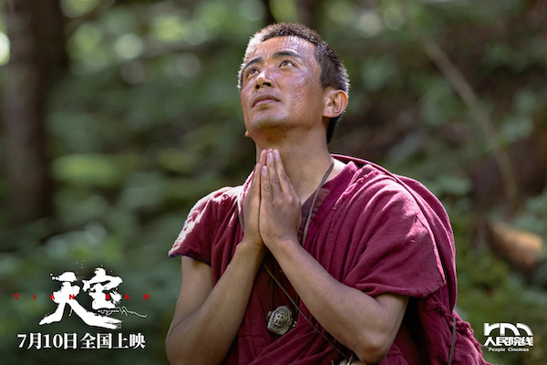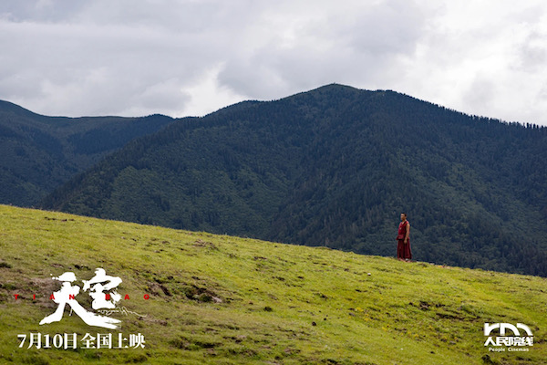 影片开篇,低沉且浑厚的民族音乐缓缓响起,镜头掠过暗色调的雪山,营造出肃穆而神秘的氛围。群山之中,一位身着红袍的藏族僧人缓缓现身,孤身行走于天地之间。随着镜头逐渐拉远,观众被引入一个特定的时空背景——中华人民共和国成立前仍深陷农奴制桎梏的四川省阿坝藏族羌族自治州马尔康,这里正是故事发生的起点。在这里,一位扎根高原、背负信仰的藏族青年“桑吉悦希”(汉名“天宝”)形象渐渐清晰。在他的眼神、行走与沉默中,我逐步感受到一种不同于以往传统的“英雄叙事”,更像是一次灵魂深处的心灵的召唤,引导观众进入一段跨越地理与民族、直抵信仰核心的精神之旅。