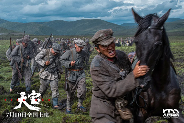 导演选择摒弃历史教科书中常见的全景俯瞰,将镜头紧紧对准天宝从宗教慈悲走向革命信仰的精神“裂变”过程。当这位藏族青年在三过草地的生死考验中艰难跋涉,当他在战友倒下的瞬间承受情感重锤,银幕前的青年观众看到的不是被符号化的英雄传说,而是血肉丰满的青春挣扎,同为青春热血的年纪,面对云涌的时代和惨淡的人生,青年观众的情绪跟剧中天宝始终仅仅相依。