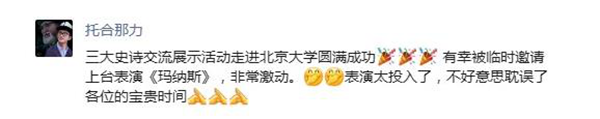 中央民族大学博士研究生托合那力·吐逊那力是《玛纳斯》的现代传承人,在中国三大史诗这十年暨中国三大史诗交流展示活动中,他现场即兴为观众们带来了一段《玛纳斯》演述,因为太过投入,演述结束后他在后台久久不能平静,活动结束后他在朋友圈发布了这样一段感想。