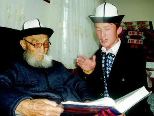 托合那力·吐逊那力跟着曾祖父居素甫·玛玛依学习演唱玛纳斯。图片由托合那力·吐逊那力本人提供